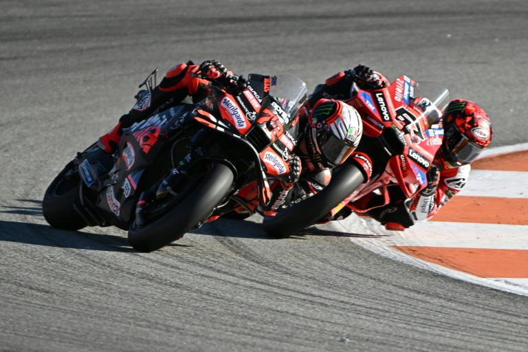El piloto italiano de MotoGP de Aprilia Marco Bezzecchi (izquierda) y su compatriota Francesco Bagnaia (Ducati), participan en una sesión de práctica antes del GP de Valencia, en el circuito Ricardo Tormo, en Cheste, el 15 de noviembre de 2025